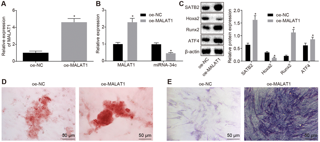 Based on the aforementioned findings, we postulated that the BMSCs-derived exosomal MALAT1 could be transferred to osteoblasts (hFOB1.19), while MALAT1 enhances the SATB2 expression in osteoblasts by sponging miR-34c, thus regulating the biological functions of SATB2 related to osteogenic function. Next, the exosomes with overexpressed MALAT1 in BMSCs were collected. Based on the RT-qPCR results, we detected that MALAT1 was significantly enriched in the exosome in the BMSCs with overexpressed MALAT1 (Figure 4A). These exosomes were co-cultured with osteoblasts (hFOB1.19), with the MALAT1 expression in the osteoblasts (hFOB1.19) detected by RT-qPCR found to be consistent with that in Figure 4A. Furthermore, we found that the expression of miR-34c in hFOB1.19 was reduced (Figure 4B). The Western blot analysis results indicated that osteoblasts (hFOB1.19) treated with oe-MALAT1 exhibited increased expression of SATB2, Runx2 and ATF4 as well as decreased expression of Hoxa2 (Figure 4C). The results of both the alizarin red staining and ALP staining revealed there was elevated calcified nodules and ALP staining intensity in the osteoblasts (hFOB1.19) treated with exosomal MALAT overexpression (Figure 4D–4E). These results suggest that BMSCs-derived exosomal MALAT1 promotes osteoblast activity.