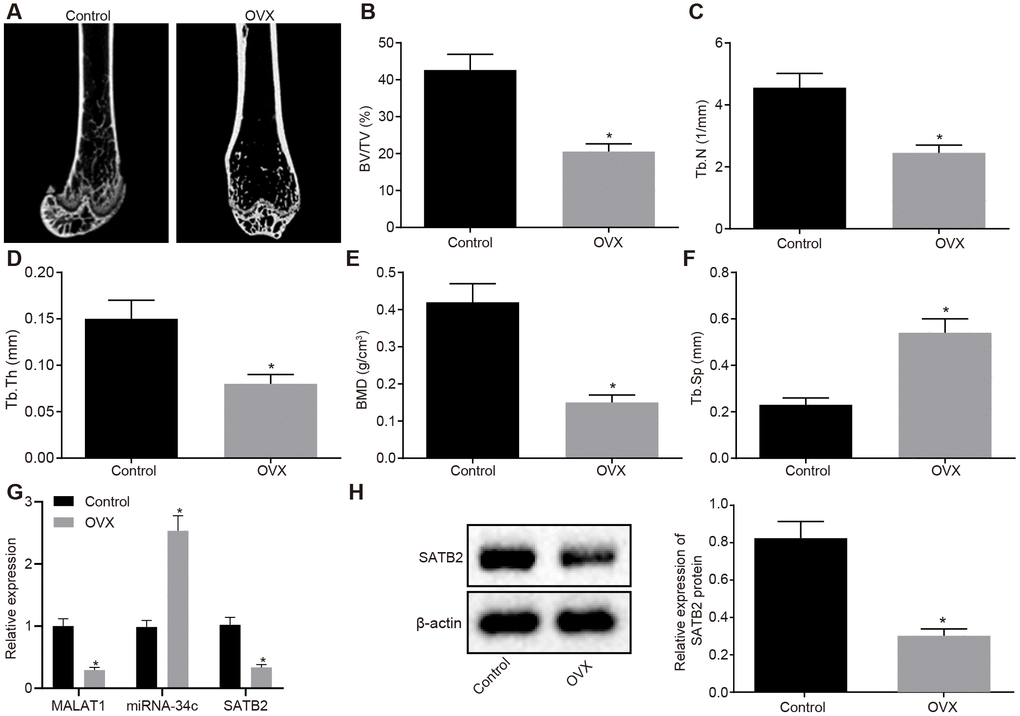 In order to confirm successful modeling, we initially conducted Micro-CT 3D imaging analysis of the distal femur of control mice and ovariectomized (OVX) mice. The results indicated that compared with control mice, OVX mice had considerably thinner bone trabeculae, disordered structure of bone trabecula, lower intertrabecular connectivity, increased cortical bone separation and thinner bone cortex (Figure 5A). The quantitative results of the microstructure parameters demonstrated that the bone volume fraction (BV/TV), the bone trabecula number (Tb. N), the bone trabecula thickness (Tb. Th) and the bone mineral density (BMD) values of the OVX mice were significantly decreased when compared with the control mice, with the value of the bone trabecula separation (Tb. Sp) found to be significantly enhanced (Figure 5B–5F). The results demonstrated that the OVX mice were significantly different from the control mice, and the model of the osteoporotic mice was established. The expression of MALAT1, miR-34c and SATB2 in OVX and control mice was measured by RT-qPCR and Western blot analysis, respectively. Our results provided confirmation illustrating that when compared to the control mice, the expression of MALAT1 and mRNA and protein expression of SATB2 were significantly decreased, while the expression of miR-34 was increased (Figure 5G–5H).