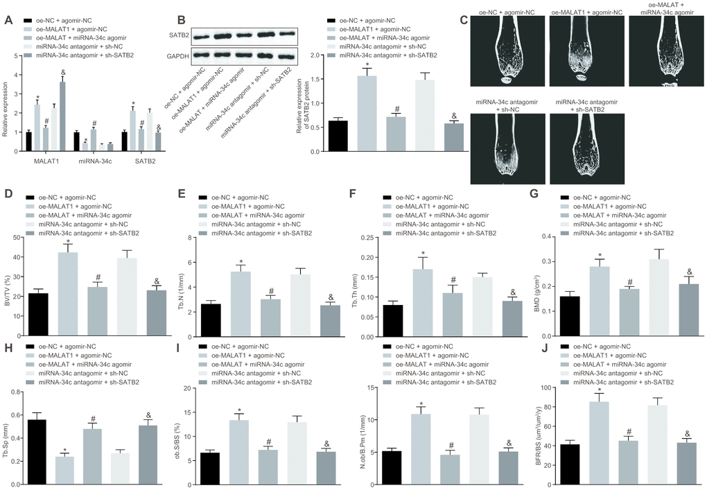 Next, we injected oe-MALAT1, miR-34c agomir, miR-34c antagomir or sh-SATB2 into successfully modeled OVX mice. The expression of MALAT1, miR-34c and SATB2 in mouse femoral tissues was detected by RT-qPCR, the results of which indicated that mice injected with oe-MALAT1 + agomir-NC exhibited elevated expression of MALAT1 and SATB2 while decreased expression of miR-34c, and the mice injected with oe-MALAT1 + miR-34c agomir exhibited a reduced expression of MALAT1 and SATB2 while elevated miR-34c expression was identified. Elevated expression of MALAT1 and reduced expression of SATB2 were detected in the mice injected with miR-34c antagomir plus sh-SATB2 compared to mice injected with miR-34c antagomir and sh-NC (Figure 6A). The protein expression of SATB2 detected by Western blot analysis was consistent with the mRNA expression of SATB2 (Figure 6B). Next, the micro-CT 3D image of the distal femur of mouse revealed signs of a thickened bone trabecula, increased intertrabecular connectivity, decreased cortical bone separation, and thickened cortical bone were found in mice injected with oe-MALAT1. However, in the mice injected with miR-34c agomir or sh-SATB2, our results revealed signs of a thinned bone trabecula, disordered structure of bone trabecula, decreased intertrabecular connectivity, increased cortical bone separation, and thinned cortical bone (Figure 6C). Quantitative analysis of the microstructure parameters indicated that mice injected with oe-MALAT1 exhibited increased values of BV/TV, Tb.N, Tb.Th and BMD in distal femur, while the value of Tb. Sp decreased significantly. Meanwhile, in mice injected with miR-34c agomir or sh-SATB2, decreased values of BV/TV, Tb.N, Tb.Th and BMD in distal femur as well as increased value of Tb. Sp were detected (Figure 6D–6H). Bone histomorphometry analysis of mouse vertebra exhibited an increase in the number of osteoblasts in mice injected with oe-MALAT1, while decreased levels were identified in mice injected with miR-34c agomir or sh-SATB2 (Figure 6I). Based on the analysis of calcitonin double labeling, increased bone formation rate was detected in mice injected with oe-MALAT1, while the bone formation rate in the mice injected with miR-34c agomir or sh-SATB2 was decreased (Figure 6J). Taken together, the results suggest that oe-MALAT1, oe-SATB2 or si-miRNA-34c could help prevent osteoporosis in OVX mice.