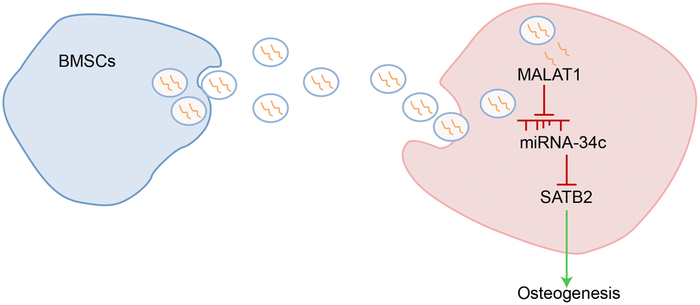 In summary, our study provides evidence that BMSCs-derived exosomal MALAT1 may contribute to enhanced osteogenic activity and alleviated symptoms of osteoporosis in the mouse model by acting as a miR-34c sponge to upregulate SATB2 expression (Figure 7). These results provide a broader understanding of the pathogenesis of osteoporosis as well as novel therapeutic strategies for its treatment. However, further experiments in the future are required to characterize whether miR-34c and MALAT1 might form a competing endogenous RNA network, and to validate the expression pattern of MALAT1, miR-34c and SATB2 in clinical samples. In addition, the effect of MALAT1 on osteogenic differentiation may be explored in transgenic mice in near future.