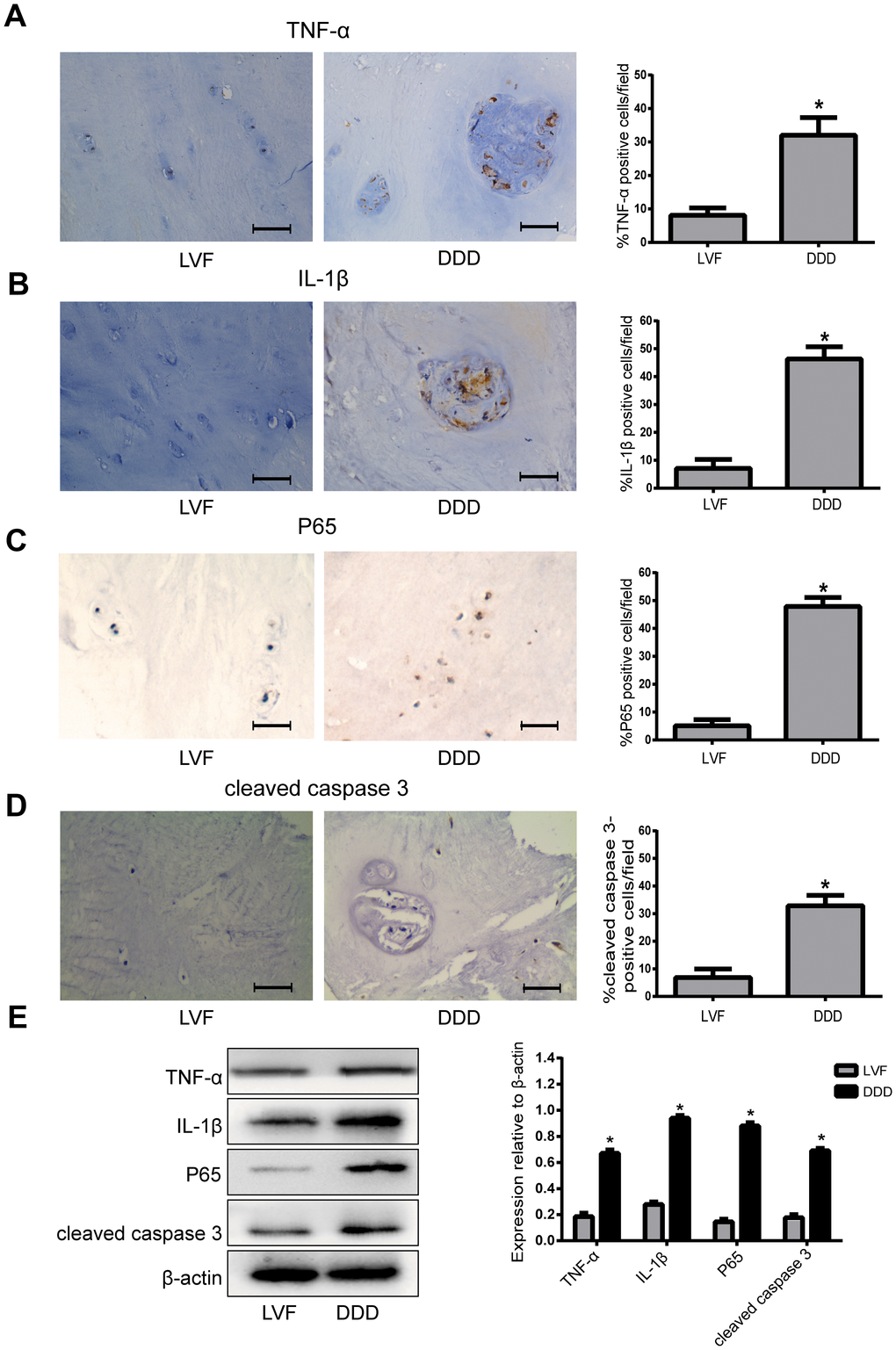 Basal expression of TNF-α, IL-1β, P65 and cleaved caspase 3 in human NP tissues