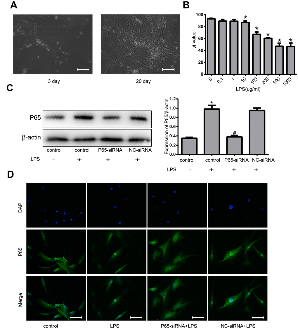 As shown in Figure 2A, primary degenerated NP cells were mainly polygonal, irregular fusiform or flaming cell clusters. P0 generation nucleus pulposus cells grow slowly, taking more than 20 days to reach 80~90% confluence. In order to find the appropriate concentration of LPS to deal with NPCs, the Cell Counting Kit-8 (CCK-8) was used, the results of which showed that LPS significantly reduced the viability of NPCs. The group treated with 500 μg/ml or 1000 μg/ml LPS had the highest inhibition of viability of NPCs among any other concentrations of LPS, suggesting 500 μg/ml LPS may be the maximal effective dose for inhibiting the viability of NPCs (Figure 2B). Therefore, we decided to use 500 μg/ml LPS in the rest of the experiments in this study. To investigate the effects of P65-siRNA on NF-κB pathway, western blot was used to measure the protein expression of P65. The levels of P65 were markedly increased in NPCs stimulated with LPS compared with the control cells. However, the NPCs transfected with P65-siRNA markedly reduced the level of P65 (Figure 2C). Furthermore, the NPCs were subjected to immunofluorescence to analyze the nuclear translocation of P65. As shown in Figure 2D, knockdown of P65 inhibited the nuclear translocation of P65 compared with LPS treatment.