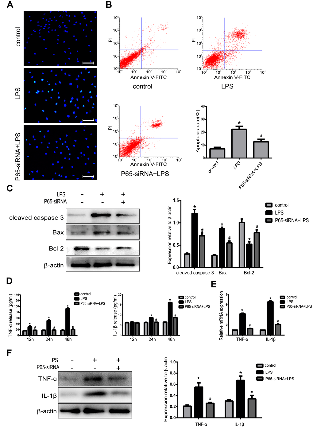 In order to demonstrate the association between the NF-κB pathway and NPCs apoptosis. Hoechst 33258 staining showed that there were less apoptotic cells with high bright fluorescent nuclei in P65-siRNA treatment group than LPS treatment group (Figure 3A). In addition, the results of Annexin V/PI double-staining demonstrated that the number of apoptotic NPCs was significantly decreased by P65-siRNA treatment compared with LPS treatment (Figure 3B). Simultaneously, western blot results showed that knockdown of P65 decreased the expressions of apoptotic protein cleaved caspase 3 and Bax; however, increased the expression of anti-apoptotic protein Bcl-2 compared with LPS treatment (Figure 3C). These experiments suggested that NF-κB inhibition decreased NP cell apoptosis in NP cells.