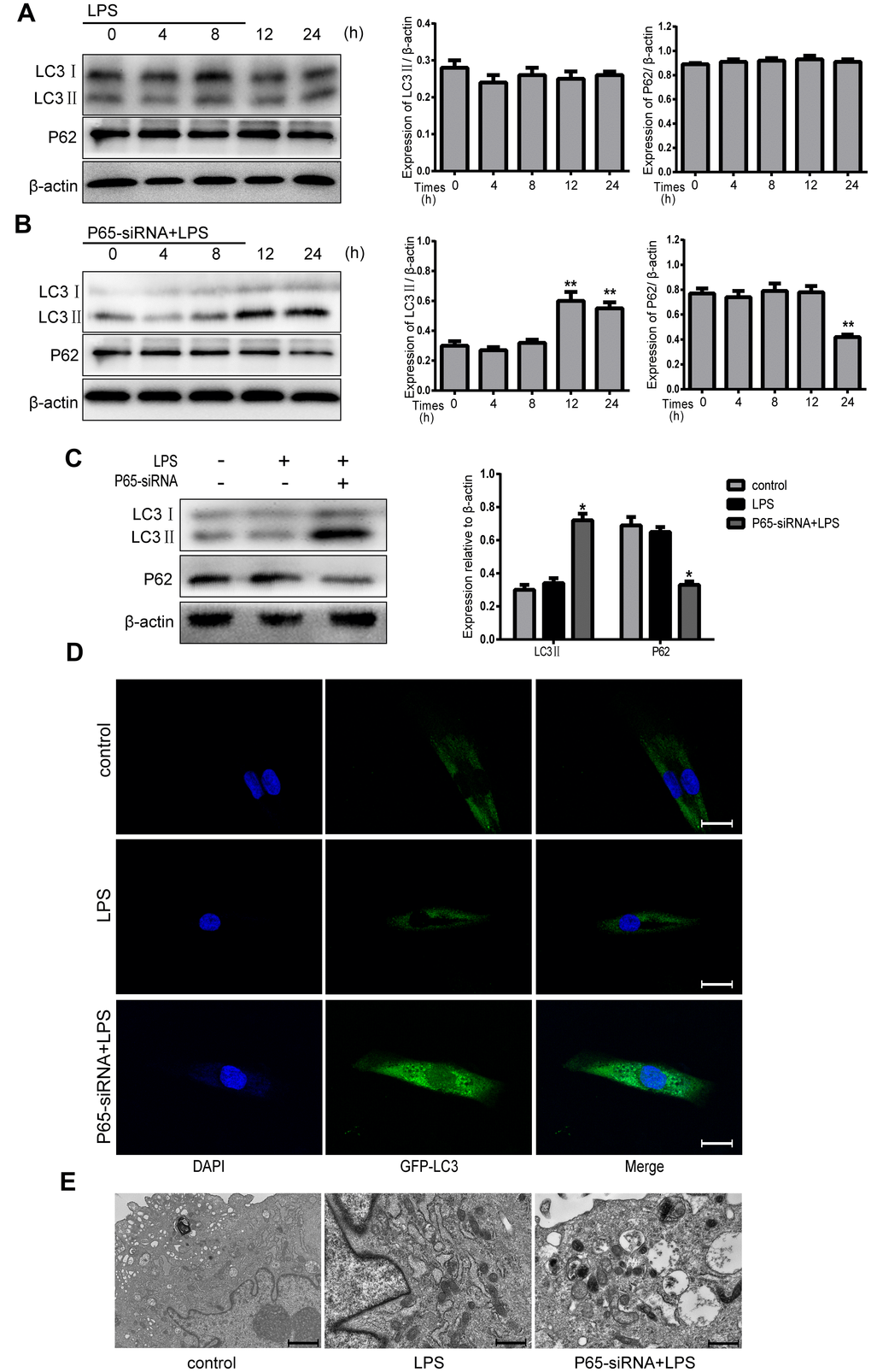 In order to investigate the relationship between NF-κB pathway and autophagy in NPCs, the cells were treated with either LPS (500 ug/ml) or LPS plus P65-siRNA for 4, 8, 12 and 24 h. Western blot results revealed that treatment with LPS for 4-24h had no significant effect on the protein expression levels of LC3 II and P62, however the protein expression of LC3 II was significantly increased at 12h and 24h, and the protein expression of P62 was significantly decreased at 24h after treatment with LPS plus P65-siRNA (Figure 4A and 4B). To further confirm activation of autophagy, the time of drug treatment, 24h, was determined for the next experiment. Western blot results shown that treatment LPS plus P65-siRNA for 24h significantly increased the protein expression of LC3 II and decreased the protein expression of P62 compared with LPS treatment (Figure 4C). In addition, Fluorescence-based detection of LC-3 isoforms were directly observed in NP cells, knockdown of P65 resulted in a significant improvement in the LC3 puncta, indicative of increased autophagosome formation (Figure 4D). Furthermore, TEM observation found that the number of typical double-membraned autophagosomes in P65-siRNA treatment group was more than that in the LPS treatment group (Figure 4E).