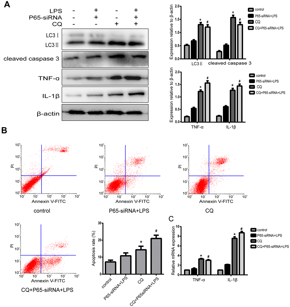 In order to investigate whether the effect of NF-κB on NP cell apoptosis and inflammation was mediated by autophagy, the cells were pretreated with 10 um chloroquine (CQ), an autophagy inhibitor, which inhibits autophagosome-lysosome fusion. Western blot results revealed that the expression of LC3-II was significant higher in NP cells with pretreatment CQ than those treated with or without LPS+P65-siRNA, suggesting autophagy was inhibited. CQ pretreatment significantly increased the expression of cleaved caspase 3 and the incidence of NP cell apoptosis compared with or without LPS+P65-siRNA (Figure 5A and 5B). These results showed that NF-κB inhibition decreased NP cell apoptosis by promoting autophagy. Moreover, western blot and RT-PCR results showed that the protein and mRNA expression levels of TNF-α and IL-1β significantly increased in NP cells with CQ pretreatment compared with or without LPS+P65-siRNA, suggesting that NF-κB inhibition reduced NP cell inflammation by promoting autophagy (Figure 5A and 5C).