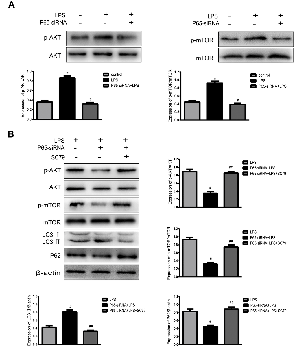 In order to demonstrate the mechanism of inhibiting NF-κB to promote autophagy, the autophagy-related pathway proteins were measured by western blot. The results indicated that NF-κB inhibition significantly decreased p-AKT and p-mTOR expression compared with LPS treatment, while AKT activation (SC79) restored p-mTOR levels and decreased autophagy (Figure 6). In summary, Inhibiting NF-κB promotes autophagy through the regulation of the AKT/mTOR pathway in LPS- induced NP cells.