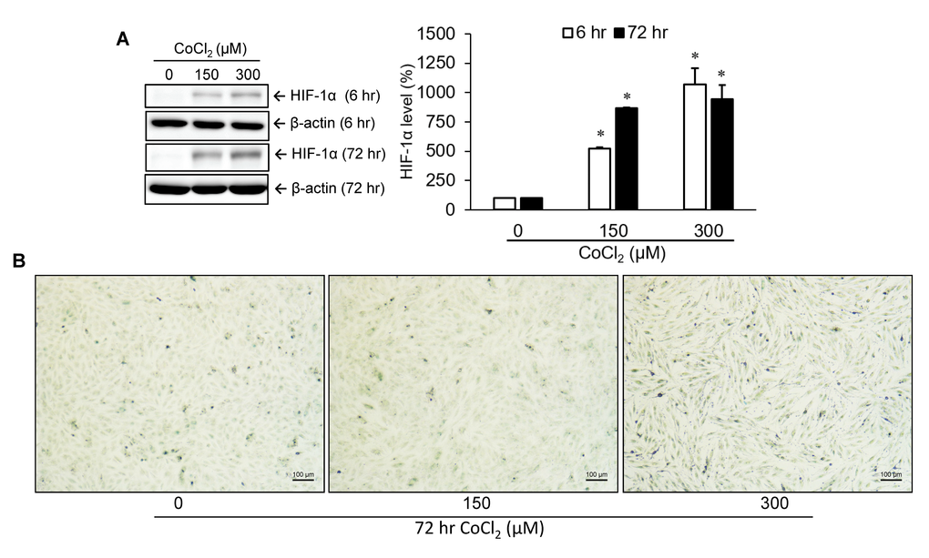 HIF-1α, a critical transcription factor involved in hypoxia-mediated gene expression, was markedly upregulated at an early time point (6 hr) after treatment with several concentrations (0, 150, and 300 μM) of cobalt dichloride. An increased level of HIF-1α could still be detected at 72 hr post-treatment (Figure 1A). To identify the production of cellular senescence, senescence-associated β-galactosidase (SA-β-gal) activity within cells was detected by cytochemical staining (Figure 1B). Experimental results revealed that 72 hr of treatment with cobalt dichloride dose-dependently induced blue-green staining of a portion of cells, a representative feature of senescent cells. This result suggested that cell senescence was promoted under incubation condition with 300 μM CoCl2 for 72 hr.