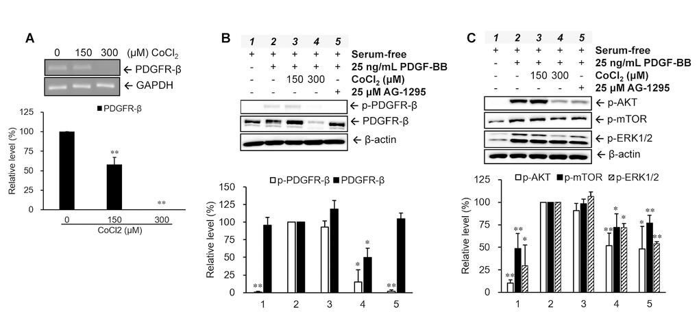Regulations of the PDGFR-β gene and protein were analyzed in VSMCs treated with various concentrations (0, 150, and 300 μM) of CoCl2 for 72 hr. Our data indicated that CoCl2 treatment diminished gene and protein expressions of PDGFR-β in a dose-dependent manner (Figure 3A, 3B). Moreover, the phenomenon of PDGFR-β activation (phosphorylation) induced by 25 ng/ml of PDGF-BB was also obviously attenuated in VSMCs treated with 300 μM CoCl2, the repression of which was very similar to the inhibitory effect of AG-1295, a PDGFR blocker (Figure 3B). Likewise, activation levels of downstream signaling molecules of PDGFR-β, such as AKT, mTOR, and ERK1/2, were increased after PDGF-BB incubation, which was reversed by adding 25 μM of AG-1295 to normal cells. However, the PDGF-stimulated increases in the activations of AKT, mTOR, and ERK1/2 proteins were obviously reduced in cells incubated with 300 μM CoCl2 for 72 hr (Figure 3C).