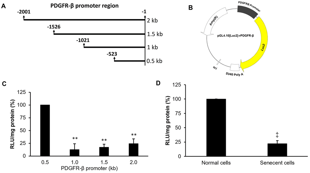 To further understand the mechanism of downregulation of the PDGFR-β gene in senescent cells, several lengths (0.5, 1.0, 1.5, and 2.0 kb) of PDGFR-β promoter segments were cloned into a luciferase-based reporter vector, pGL4.10[Luc2], to measure their individual promoter activities (Figure 4A, 4B). The analyzed data indicated that the proximal segment ranging -523 to -1 of the PDGFR-β promoter possessed the highest promoter activity among all promoter segments (Figure 4C). Therefore, the constructed reporter vector with the proximal segment (-523 to -1) of the PDGFR-β promoter was further transfected into both normal and senescent cells, and the experimental data demonstrated that promoter activity was significantly reduced in senescent cells compared to that of normal cells (Figure 4D).