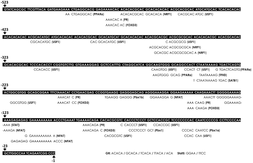 To investigate whether these 18 TFs can possibly interact with the proximal segment (-523 to -1) of the PDGFR-β promoter, potential binding sites of these TFs were analyzed and predicted by two TRANSFAC®-based bioinformatics on-line software programs (PROMO and MatInspector). According to the prediction results, putative binding sites of the TFs, including NFAT, SATB1, FOXD3, PPAR, TFIID, NRF1, Stat5, GR/PR, USF-1, and Pbx1, were predicted to be within the proximal segment (-523 to -1) of the PDGFR-β promoter (Figure 5).