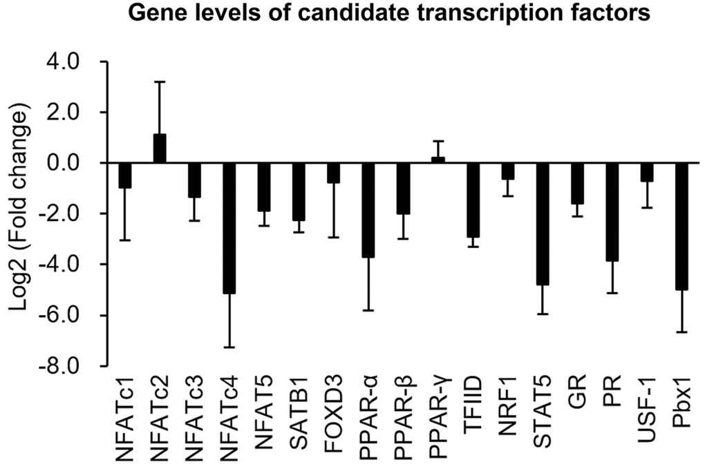 To clarify whether decreases in TF-binding levels could be attributed to reductions in TF expressions in senescent cells, transcriptional levels of these ten TFs were further measured using a quantitative polymerase chain reaction (qPCR). The experimental data showed that gene expressions of seven TFs, viz., NFATc4, SATB1, PPAR-α, TFIID, PR, STAT5, and Pbx1, were markedly reduced (>2-fold change) in senescent cells compared to those in normal cells (Figure 6).