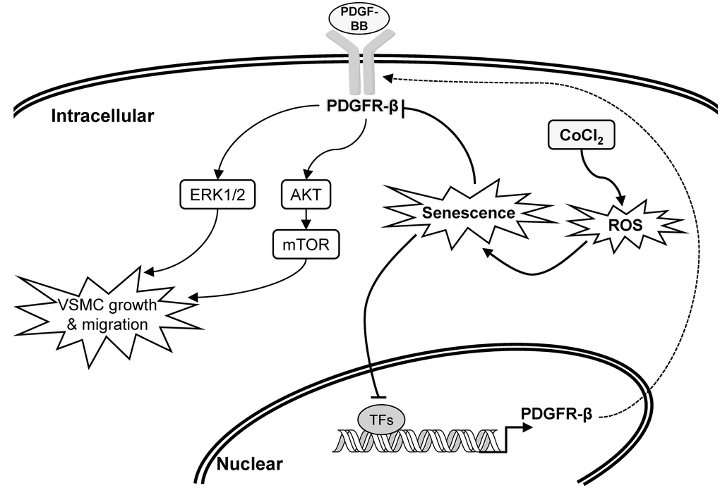 The possible relationship between expression of the PDGF receptor and cellular senescence has been explored previously. Aoyagi et al. indicated that kinetics of PDGF-BB binding and the expression of beta-subunit of the PDGF receptor were prominently reduced during cellular senescence in human VSMCs from the three strains [55]. Furthermore, tyrosine phosphorylation of the PDGF receptor was also greater higher in young VSMCs than that in aged cells. Besides, it has also been demonstrated that RNA and protein expressions of PDGFR-β were significant diminished in replicative senescent cells and oxidative stress-induced premature senescent cells [56]. In our study, transcriptional, translational and activation levels of PDGFR-β have also been markedly suppressed in oxidative stress-induced senescent VSMCs (Figure 3). PDGF/PDGFR-β signaling pathway plays a critical role in the progression of neointimal hyperplasia (restenosis) through stimulating VSMC proliferation and migration. Thereby, multiple suppressions of PDGFR-β provided partial mechanisms to explain why senescent VSMCs was insensitive to PDGF-BB-mediated stimulation (Figure 2) and prevalence of restenosis was lower in aged population (Table 2). Despite previous studies have collectively linked the causality among senescent VSMCs, PDGFR-β suppression, and prevalence of restenosis in aged arteries. However, in the future, we can still use the rat’s model introduced with balloon angioplasty to further verify the changes of expression profiles in PDGFR-β and its downstream molecules as well as PDGFR-β expression-associated transcription factors within the balloon-injured region of arteries between younger and older rats