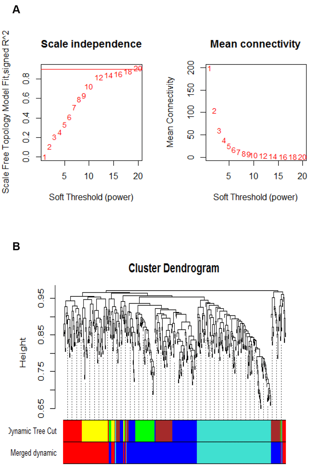 After microarray data preprocessing, a total of 2,256 differentially expressed Agilent transcripts were left. We further removed ambiguous probes and duplicated genes. The ambiguous probes included positive and negative controls in the microarray, and the duplicated genes were removed according to their gene symbols. Finally, the expression values of the 469 differential genes were selected for subsequent analysis. In graph theory, the nodes with higher connections are more likely to be pivotal connectors. Likewise, critical points controlling important dynamic components in biological networks [21], removal of them may cause biological systems failure in saving their coherence. In order to identify such interconnected genes from aging-associated co-expression network abstractly, adjacency matrix was obtained from the Pearson correlation matrix with a power β=12 based on the scale-free topology criterion [21]. Subsequently, the represented matrix was transformed to similarity matrix in clustering process during which genes grouped in a cluster were likely to be biologically relevant to the same pathway. The value of power β=12 could emphasize robust correlations and remove unreliable correlations between genes on an exponential level. Figure 1A shows the determination of β parameter based on the description in the WGCNA manual. Briefly, given Agilent series GSE50833, we used the WGCNA to establish a number of modules in co-expression network, and 6 modules were obtained (Figure 1B). As illustrated in Figure 1B, modules in gene dendrogram are shown in different colors and based on dynamic branch cutting algorithm underneath row color assigns the modules membership.