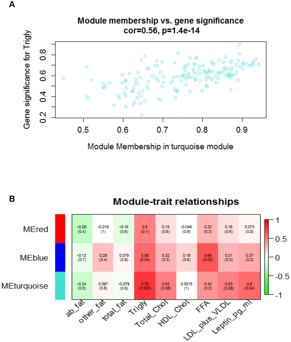 Our clinical implication of significant modules indicated that triglyceride and leptin levels are correlated with the turquoise module, and triglyceride and free fatty acid (FFA) levels are correlated with blue module, respectively. Whereas the correlation between triglyceride level with turquoise module was higher than that with blue module (Supplementary Figure 6 and Supplementary Table 11). Noblet et al. suggested that leptin is a key modulator in pathways involved in vascular proliferation [25]. Additionally, leptin sensitivity pointed to be declined during aging in rodents [26]. People found that hypertriglyceridemia may act as a prevalent risk factor for cardiovascular disease [27] and free fatty acid level may increase with aging [28].