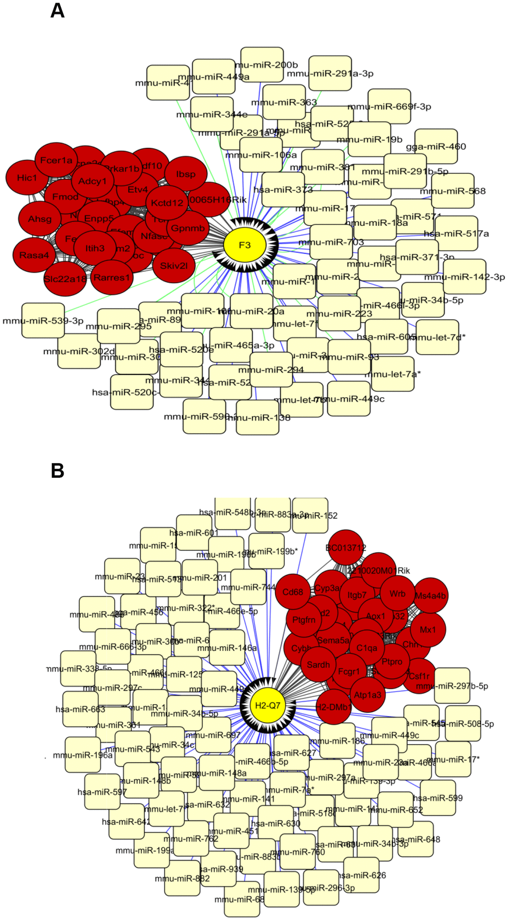 The top 30 interconnected genes within each of the turquoise, blue and red modules were graphically depicted by utilizing Cytoscape (Supplementary Table 17, Supplementary Table 19, Supplementary Table 21). Interestingly, miRNA-target analysis showed that in the turquoise module, gene F3 is putatively targeted by 23 and 38 predicted miRNAs from TargetScan and MicroCosm respectively (Figure 3A). Additionally, in the blue module, gene H2-Q7 illustrated to be targeted by 78 miRNAs in MicroCosm (Figure 3B). No genes were found to be targeted with miRNAs in the red module. Among the miRNAs, mmu-miR-449a, mmu-miR-449c, mmu-miR-34c, mmu-miR-34b-5p, mmu-miR-15a, and mmu-let-7 were listed as common between networks built by turquoise and blue modules. Due to the inconvenience of considering a highly dimensional set of transcription factors, we only investigated transcription factors in a network of the top 90 connected hub nodes depicted for mRNA-miRNA interaction analysis (Supplementary Table 9), when transcription factors Pax8 and Hsf1 were ranked as the most significant based on the normalized enrichment score test (NES) (Table 2).