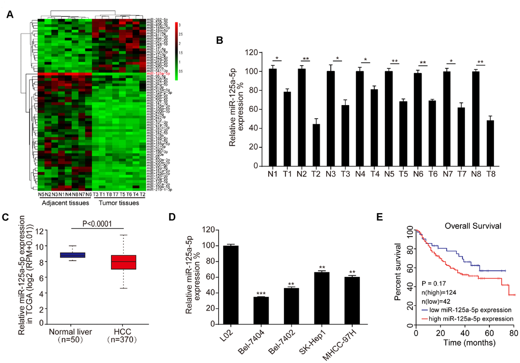 We used a microarray to compare miRNA expression in eight matched pairs of HCC tissues and adjacent normal tissues. Differentially expressed miRNAs, which were defined by a ≥ 2-fold change in expression between the two tissue types and associated P-values ≤ 0.05, are shown in the heat map in Figure 1A. The microarray assay indicated that miR-125a-5p expression was decreased in HCC tissues compared to adjacent normal tissues; this was also the most statistically significant difference observed (Figure 1A, Supplementary Table 1). qRT-PCR also revealed that miR-125a-5p expression was down-regulated in the eight matched pairs of HCC tissues compared to the adjacent normal tissues (Figure 1B). Moreover, miR-125a-5p expression was down-regulated in HCC tumor tissues compared to adjacent normal tissues in TCGA from the Starbase database [38] (http://starbase.sysu.edu.cn/) (Figure 1C). In addition, qRT-PCR indicated that miR-125a-5p expression was lower in HCC cell lines (Bel-7404, SK-Hep1, Bel-7404, and MHCC-97H) than in a normal liver cell line (L02) (Figure 1D). However, Kaplan-Meier survival curves indicated that overall survival in HCC patients was not associated with miR-125a-5p expression level [39] (http://www.kmplot.com/mirpower) (Figure 1E). This may be due to the small number of samples examined. Furthermore, there is a particularly large amount of heterogeneity among HCC patients which might also have prevented detection of associations between miR-125a-5p expression and survival.