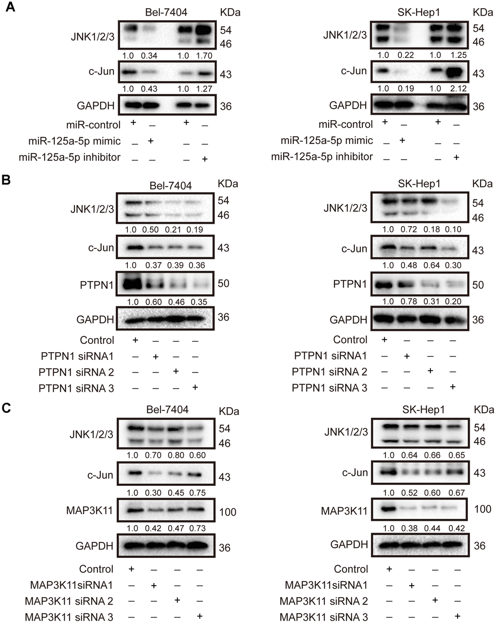 In mammals, there are four major subgroups of the MAPK family: the extracellular signal-regulated kinases 1 and 2 (ERK1/2), JNK, p38, and ERK5 pathways [47]. As mentioned above, “activation of JUN kinase activity” was one of the biological functions associated with the 131 common elements identified using target prediction databases, implying that the JNK MAPK signaling pathway might be essential for the biological function of miR-125a-5p in HCC. Next, we confirmed that miR-125a-5p overexpression reduced, while miR-125a-5p knockdown increased, the expression of JNK1/2/3 and c-Jun in Bel-7404 and SK-Hep1 cells (Figure 5A, Supplementary Figure 4A). Knockdown of PTPN1 and MAP3K11 also decreased JNK1/2/3 and c- Jun expression in Bel-7404 and SK-Hep1 cells (Figure 5B and 5C, Supplementary Figure 4B and 4C). These results indicate that miR-125a-5p suppressed PTPN1 and MAP3K11 expression via the MAPK signaling pathway in HCC.