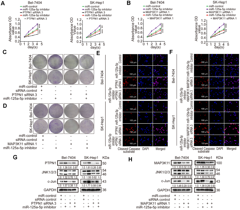 Loss of function experiments were performed using PTPN1 siRNA 3 and MAP3K11 siRNA 1, which had the highest knockdown efficiencies for their targets. The loss-of-function experiments included four groups: a control group, a group transfected with miR-125a-5p inhibitors, a group transfected with PTPN1 siRNA 3 or MAP3K11 siRNA 1, and a group co-transfected with miR-125a-5p inhibitors and PTPN1 siRNA 3 or MAP3K11 siRNA 1. CCK8 and colony formation assays showed that cell proliferation was increased in the miR-125a-5p inhibitors group and suppressed in the PTPN1 or MAP3K11 group. Immunofluorescence assays revealed that cell apoptosis was suppressed in the miR-125a-5p inhibitors group and upregulated in the PTPN1 or MAP3K11 group. Cell proliferation and apoptosis rates were similar in the co-transfected and control groups (Figure 6A–6F, Supplementary Figure 5A and 5B). In addition, co-transfection restored PTPN1, MAP3K11, JNK1/2/3, and c-Jun protein expression to control levels (Figure 6G and 6H, Supplementary Figure 5C). In addition, we performed a gain of function assay by inserting PTPN1 and MAP3K11 CDS into pCDNA3.1 (+) vectors. Western blot assays confirmed acceptable rescue efficiency and ensured that the siRNAs had no off-target effects (Supplementary Figure 5D). Together, these results indicate that miR-125a-5p suppresses cell proliferation and induces apoptosis in HCC by targeting PTPN1 and MAP3K11 via the MAPK signaling pathway.