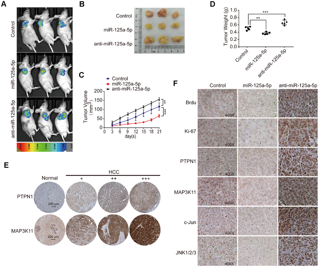 miR-125a-5p suppresses cell proliferation and induces apoptosis in HCC by targeting PTPN1 and MAP3K11 via the MAPK signaling pathway in vivo
