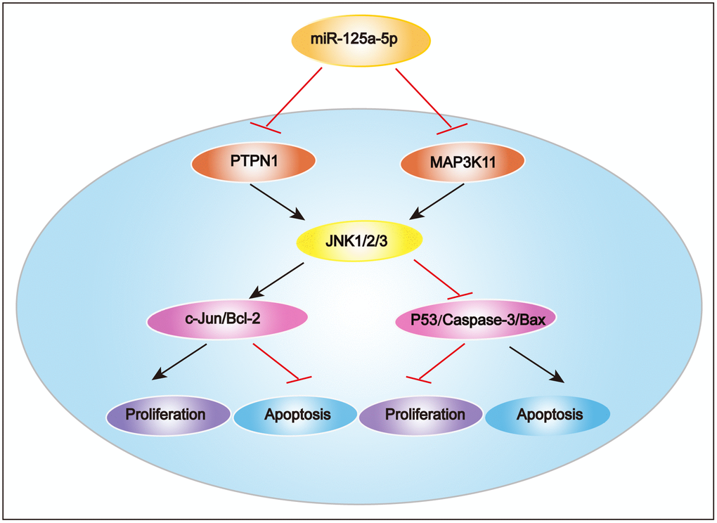 In summary, we found in this study that miR-125a-5p expression was significantly decreased in HCC tissues and cell lines compared to matched normal tissues and normal liver cells. miR-125a-5p overexpression inhibited HCC cell proliferation and induced apoptosis in vitro and in vivo, while miR-125a-5p knockdown had the opposite effects. Furthermore, PTPN1 and MAP3K11 were identified as targets of miR-125a-5p, and knockdown of PTPN1 and MAP3K11 inhibited the JNK signaling pathway to suppress HCC cell proliferation and induce apoptosis. These results indicate that miR-125a-5p inhibits HCC cell proliferation and induces cell apoptosis by directly targeting PTPN1 and MAP3K11 via the MAPK signaling pathway (Figure 8). miR-125a-5p mimics or JNK signaling inhibitors alone or in combination might therefore be potential treatments for HCC.