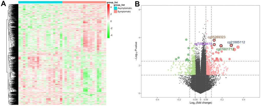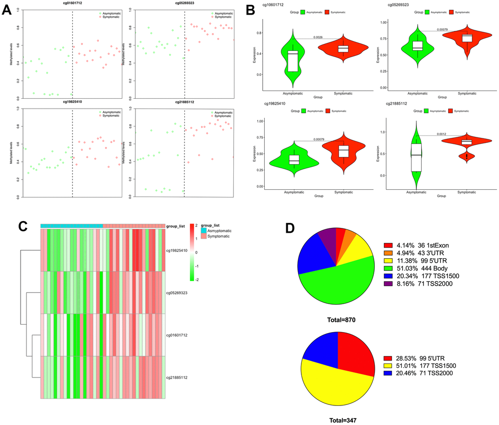 Subsequently, to recognize a set of CpGs that may differentiate symptomatic from asymptomatic patients, depending on the differentially methylated CpGs, we implemented shrunken centroid classifier analysis and found 4 hypermethylated CpGs in symptomatic patients (cg01601712, cg05269323, cg19825410 and cg21885112) that best discriminated between patients with and without symptoms (Figure 2A). These four differentially methylated loci correspond to three genes in the genome. The details can be found in Table 1. Then, we analyzed these four hypermethylated CpG sites and found that there were significant differences between them (P < 0.01–0.001) (Figure 2B). The methylation of these four differentially methylated CpG sites in the dataset is shown in Figure 2C. The proportion of differentially methylated CpG sites in the whole genome and the proportion of CpG island distribution of promoter differentially methylated CpG sites are displayed in Figure 2D.