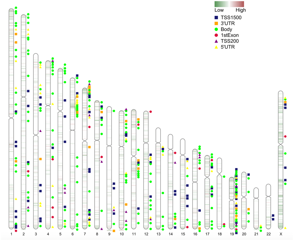 The chromosome distribution of differentially methylated intergenic CpGs is shown in Figure 3. Regions in red are hypermethylated regions, and regions in green are hypomethylated regions.