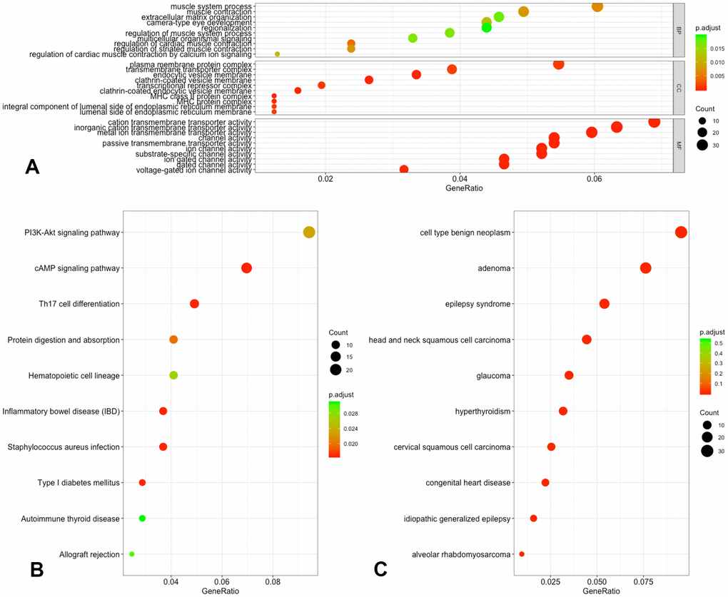As shown in Figure 4, the most important items in the development of IS and all of the detailed information can be found in Supplementary Table 2. In the analysis of GO functions, 50 biological processes, 58 cellular components as well as 46 molecular functions were recognized with adjusted-P < 0.05. Approximately 18 pathways were enriched in the KEGG pathway analysis, and none of the DO items were analyzed for the screened DMGs with adjusted-P < 0.05. However, if the threshold value was set at P < 0.05, we could include 39 DO items for further analysis.