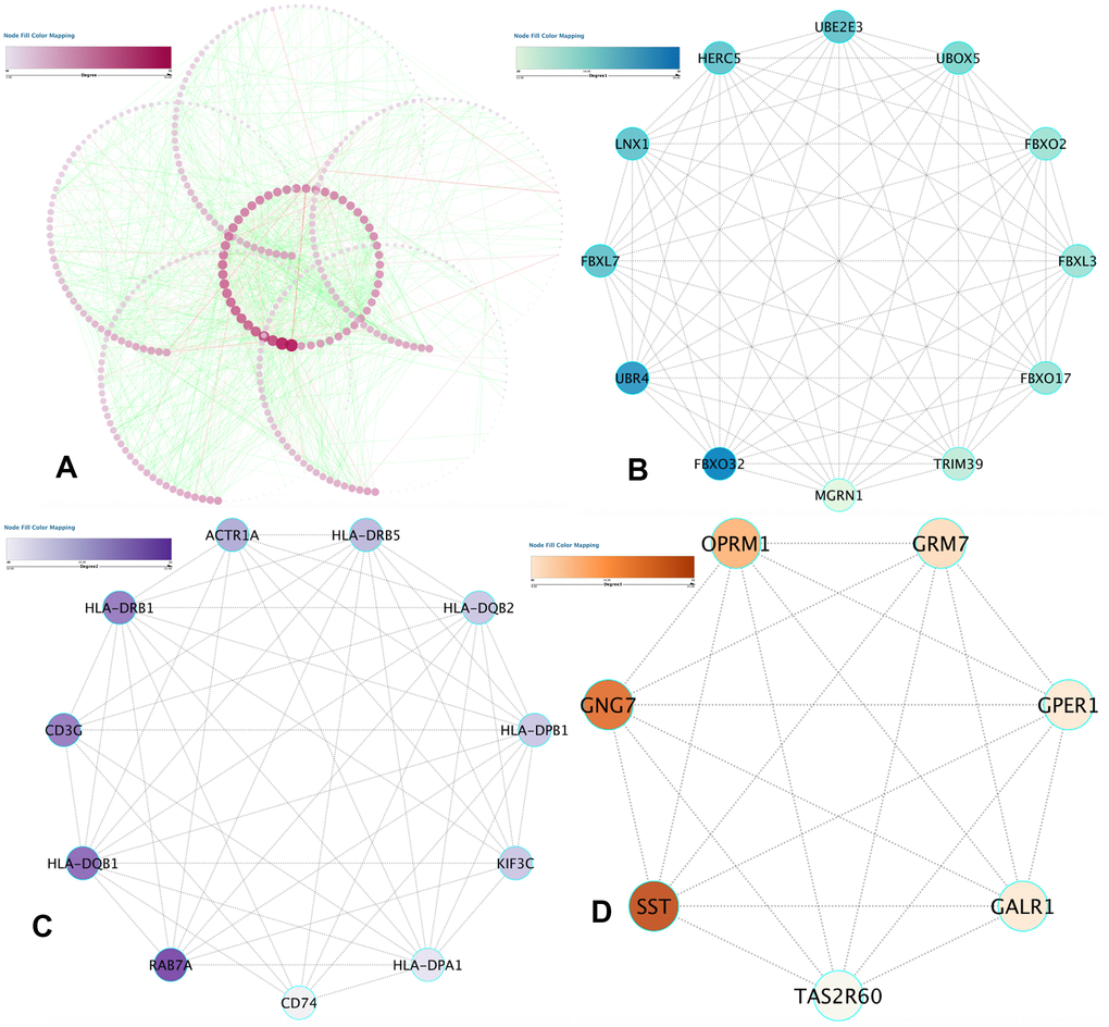 Data analysis was done on the STRING database, which revealed 1463 protein pairs and 552 nodes with a combined score > 0.9. Figure 5A shows the network analysis in Cytoscape software. When detected by the MCODE app, three modules with a score > 7 were identified and are represented in Figure 5B–5D. After synthesizing the data of GO, DO, and KEGG analyses, we selected 2 DMGs (HLA-DRB1 and HLA-DQB1) as hub genes correlated to the onset of IS with a high degree and included them in the submodule analysis at the same time.