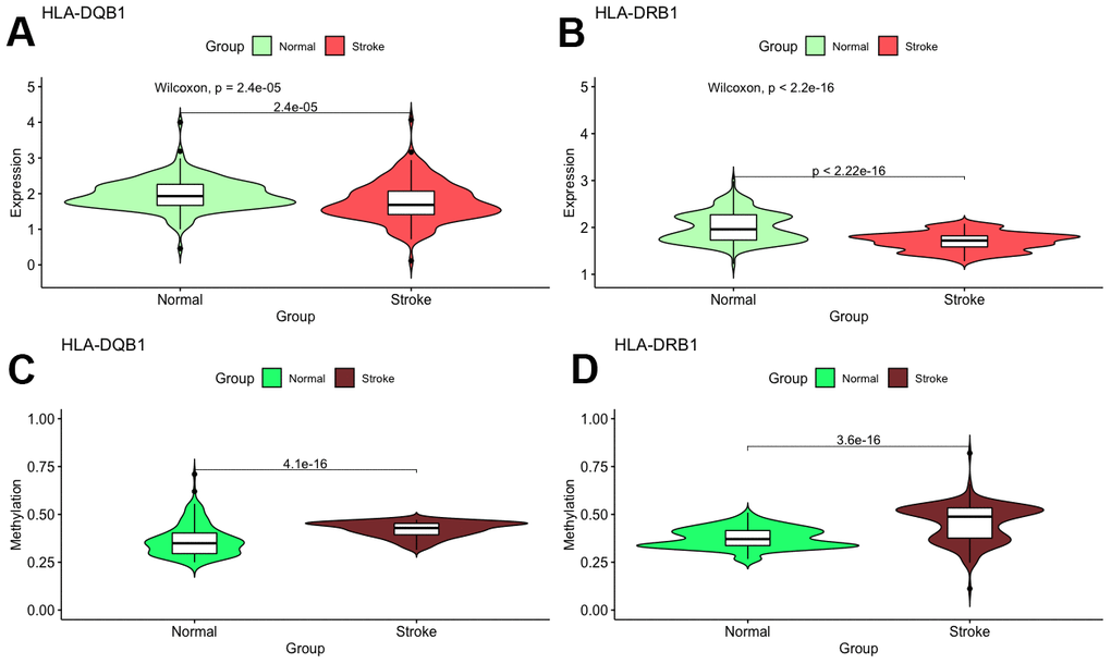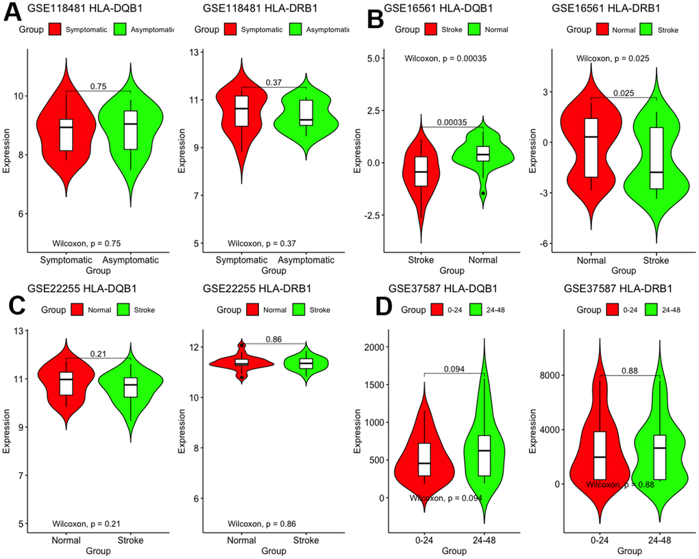 First, we validated these two genes in different microarray datasets. As shown in Figure 6, differences between the two genes were found only in GSE16561 but not in other datasets. The expression of HLA-DRB1 and HLA-DQB1 was lesser in stroke patients than in normal controls (P < 0.05).