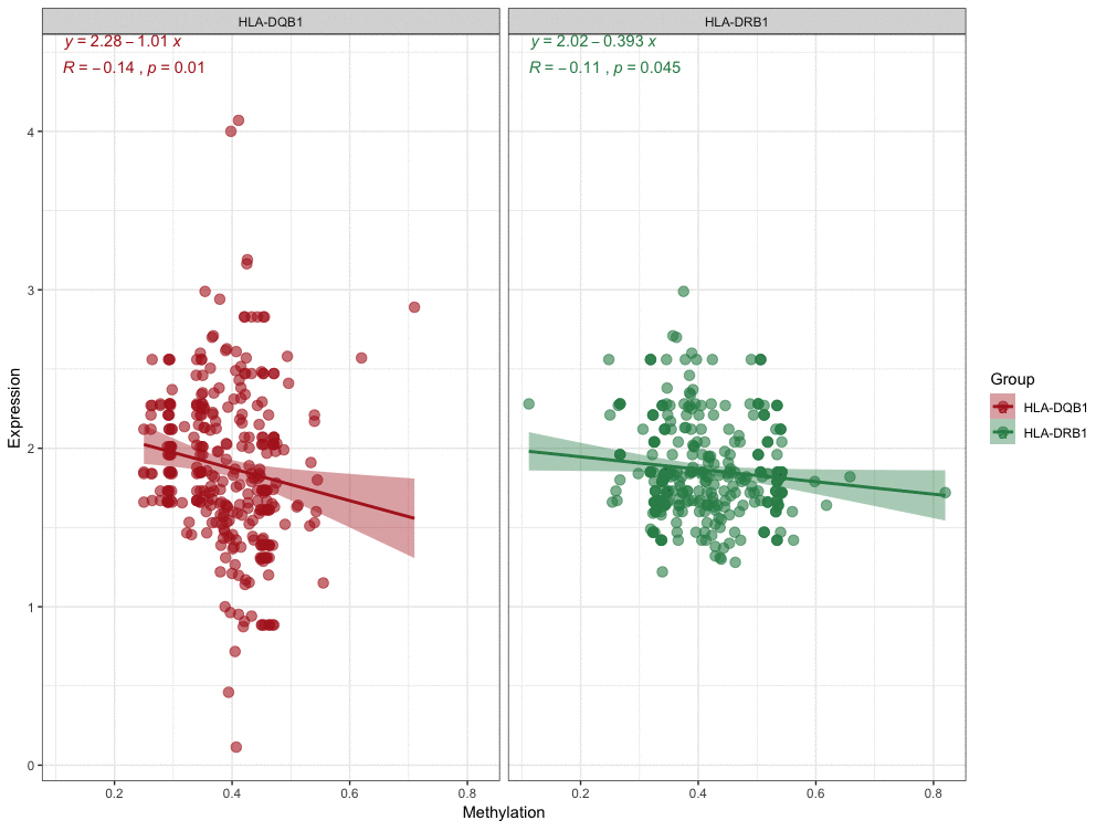 With these conditions, we selected these 2 significantly correlated methylation–mRNA pairs for testing a total of 322 samples (161 healthy control and 161 IS). The 322 validation samples were coordinated for age and sex. The weight, BMI, waist circumference, smoking status, serum TC and LDL-C levels were higher in IS patients compare to controls (Table 2). Initially, we examined the methylation of these 2 genes in two samples and established that all of them showed increased hypermethylation compared with that in the IS group (Figure 7C–7D). Next, we found that the relative expression of these two genes was lower in stroke samples (Figure 7A–7B). This result also coincided with GSE16561. Then, we implemented correlation analysis among DNA methylation and gene expression in the similar samples and established that HLA-DRB1 and HLA-DQB1 gene methylation levels were negatively associated with their expression (Figure 8). This result indirectly confirmed that modifications in the methylation of the promoter region of HLA-DRB1 and HLA-DQB1 caused atypical gene expression, causing the beginning of IS.