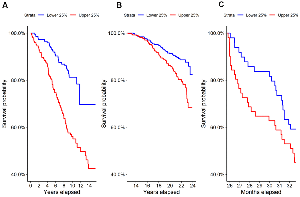 Raw metabolite intensity values were corrected for instrumental drift and underwent rank inverse normal transformation [93]. Missing covariate data were imputed as the dataset mean, and final study results underwent sensitivity analysis to demonstrate that the imputation did not cause substantive changes. Hazard ratios and p-values for all-cause mortality were determined by fitting a Cox proportional hazards model with each metabolite (e.g. glucuronic acid) as the main predictor and including as clinical covariates age, sex, smoking status, body mass index, systolic blood pressure, and diastolic blood pressure [94]. Kaplan-Meier survival curves for the upper and lower quartiles of glucuronic acid level were plotted and the log-rank test was used to test for differences between the curves. In the TwinsUK cohort, analysis also took into account family relatedness. Validation analyses for mortality in the Framingham Offspring and TwinsUK cohorts were performed using one-sided statistical tests; all other comparisons used two-sided tests.