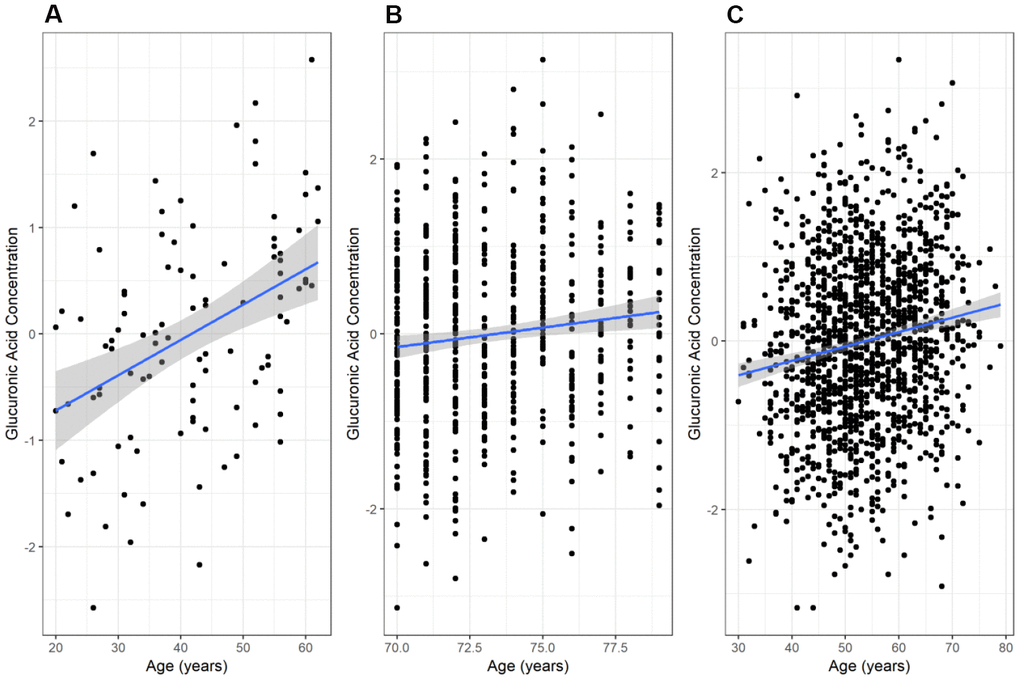 We found a significant positive correlation between glucuronic acid levels and age in the secondary Estonian Biobank cohort (N=100; r=0.41, p=2.7×10-5, Figure 2A), which was selected to span a wide range of ages. This relationship also validated in the main Estonian Biobank cohort (Pearson r=0.12, p=3.7×10-3, Figure 2B) and the Framingham Offspring cohort (r=0.16, p=1.3×10-9, Figure 2C). Multivariate models adjusted for standard clinical covariates also identified age as a significant correlate of glucuronic acid levels in all three cohorts (p=4.3×10-3, 2.0×10-8, and 2.2×10-5, respectively).