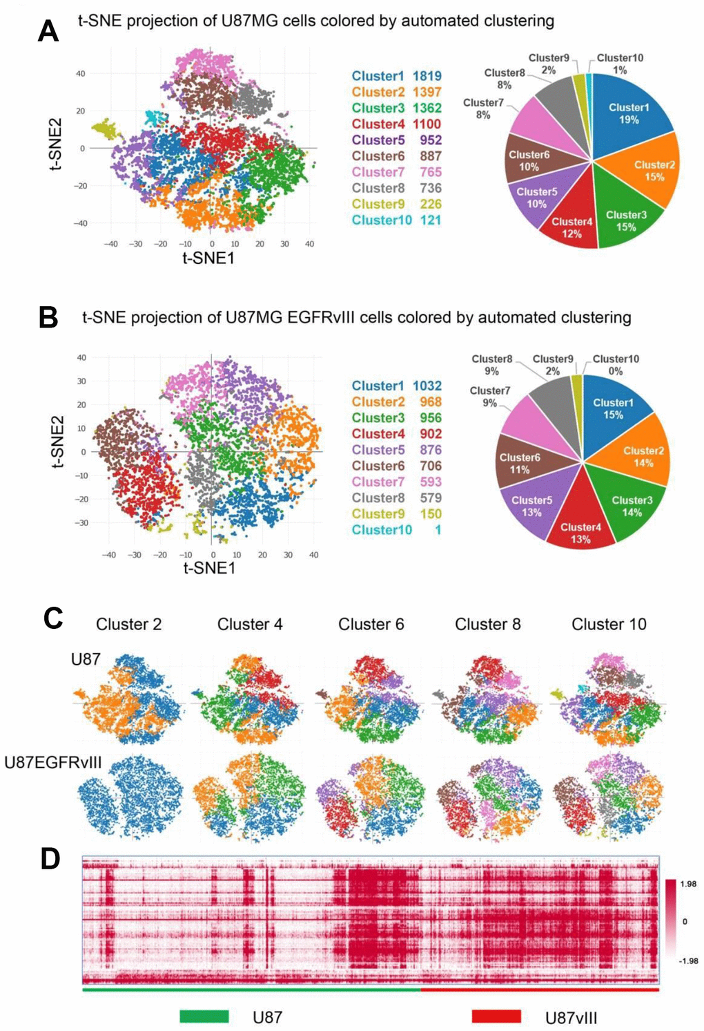 Next, K-means clustering analysis was conducted to examine cellular heterogeneity. Overall, ten distinct cell clusters were identified and visualized by the two-dimensional projection of t-distributed stochastic neighbor embedding (t-SNE, Figure 1A and 1B) [22]. Interestingly, when k was equal to two, the majority of U87MG-EGFRvIII cells belonged to the same cluster (Figure 1C). In addition, automated clustering revealed an attenuated heterogeneity of U87MG-EGFRvIII at k=4, 6, 8 and 10 (Figure 1C). The top 100 differential expression genes (Supplementary Table 1) were picked up, and clustered in all the 16128 cells. From the heatmap we can see that U87-EGFRvIII cells are more homogeneous than U87 cells (Figure 1D).