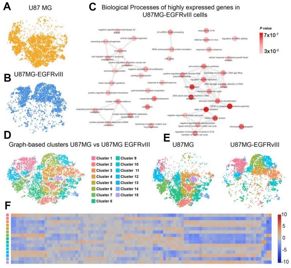 To further explore the transcriptomic differences between U87MG and U87MG-EGFRvIII cells, we subjected both libraries to the LOUPE browser simultaneously. As expected, the two populations of cells showed distinct distribution patterns (Figure 2A, 2B). The upregulated genes in U87MG-EGFRvIII cells were mainly enriched in the DNA damage response, cell division and angiogenesis processes, which was consistent with the TCGA results (Figure 2C and Supplementary Figure 2). Graph-based clustering analysis further identified 15 different subgroups with cluster-specific genes and biological processes (Figure 2D–2F). The U87MG-EGFRvIII cells were mainly distributed in cluster one (1397, 71.42%), cluster three (1108, 74.11%), cluster six (1173, 91.00%) and cluster eleven (775, 96.75%), while U87MG cells were observed in the other eleven clusters (Supplementary Figure 3), which further indicated that the heterogeneity is stronger in U87MG cells. Consistently, the biological annotations revealed that the cluster-specific biological processes in U87MG-EGFRvIII cells are associated with angiogenesis (cluster 1), DNA repair and cell division (Figure 3).