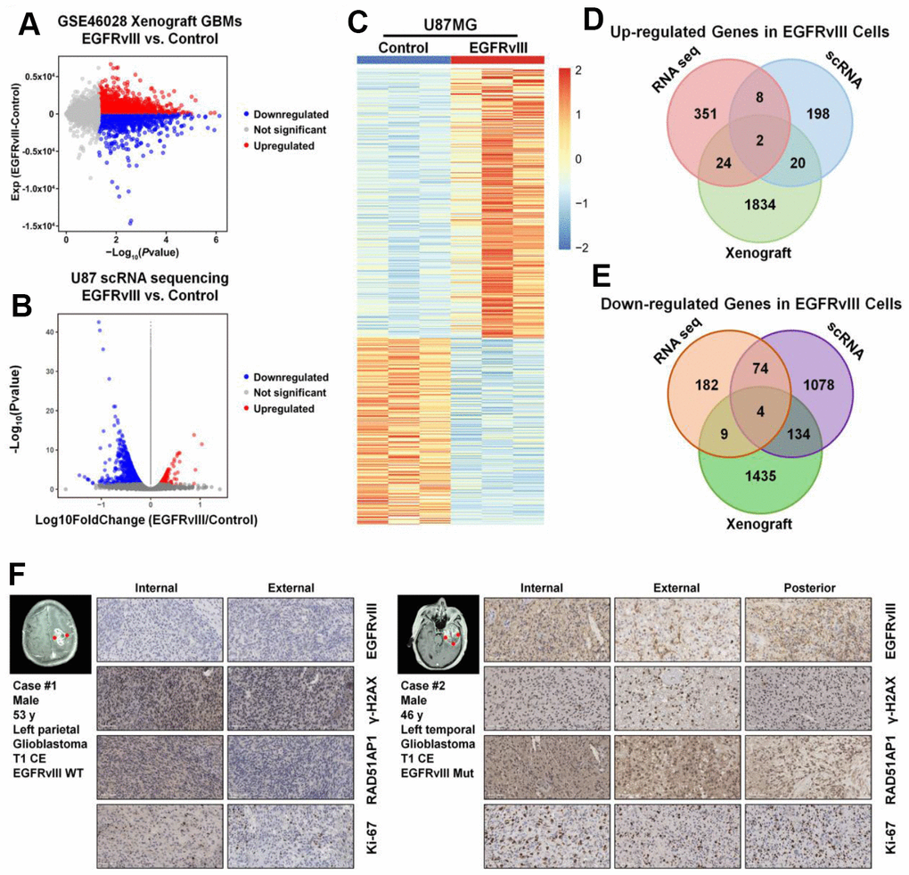 The development of single-cell RNA sequencing (scRNA-seq) techniques has enabled transcriptomic analysis within individual cells. Using scRNA-seq libraries, an increasing number of studies have attempted to dissect lineage identity, tracking dynamic cellular changes and depicting the interplay between intrinsic tumor cells and the microenvironment, thereby uncovering the intratumoral heterogeneity in glioma [18–20]. In the present study, we used microfluidic-based scRNA-seq techniques to profile single cells from U87MG and EGFRvIII-expressing U87MG cell lines, which we found to exhibit inherently variable gene expression and biological functions. We also observed enhanced transcriptional activity and decreased heterogeneity caused by the EGFRvIII mutation. By comparing the two scRNA-seq libraries, we showed that EGFRvIII could induce a phenotypic transition to enhance DNA division, DNA repair and angiogenesis. We combined the scRNA-seq data with bulk U87/U87-EGFRvIII RNA-seq data and EGFRvIII xenograft RNA-seq data under accession number GSE46028 and found RAD51AP1 to be upregulated in three of the databases. Furthermore, we showed that RAD51AP1 was a GBM oncogene by bioinformatics analysis, generated an intracranial mouse glioma model and performed clinical multiple spot samplings. Therefore, our study reveals the impact of EGFRvIII on the dynamic alterations of glioma cells at single-cell resolution, further elucidating the exact mechanism of EGFRvIII in glioma and identifying the role of RAD51AP1 in GBM.