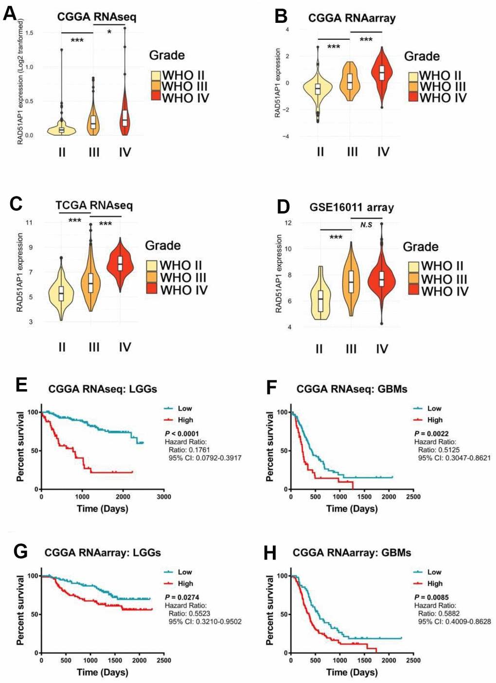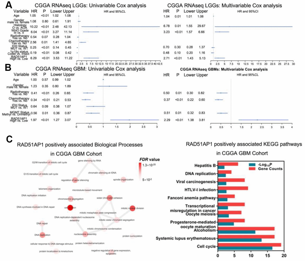 While RAD51AP1 is known to promote RAD51-mediated homologous recombination [13], the role of RAD51AP1 in glioma has rarely been studied. Bioinformatic analyses revealed that RAD51AP1 is significantly enriched in high-grade gliomas in the CGGA, TCGA and GSE16011 datasets (Figure 5A–5D). Kaplan-Meier survival analysis confirmed the poor outcomes of patients with both low- and high-grade gliomas expressing high levels of RAD51AP1 (Figure 5E–5H). Uni- and multivariable Cox analyses further indicated that RAD51AP1 is an independent prognostic factor of clinical and molecular pathological parameters in the CGGA and TCGA databases (Figure 6A and 6B and Supplementary Figure 4). Notably, the RAD51AP1 positively associated genes were mainly enriched in DNA repair and cell cycle-related biological processes and KEGG pathways in both the CGGA and TCGA databases (Figure 6C and Supplementary Figure 5).