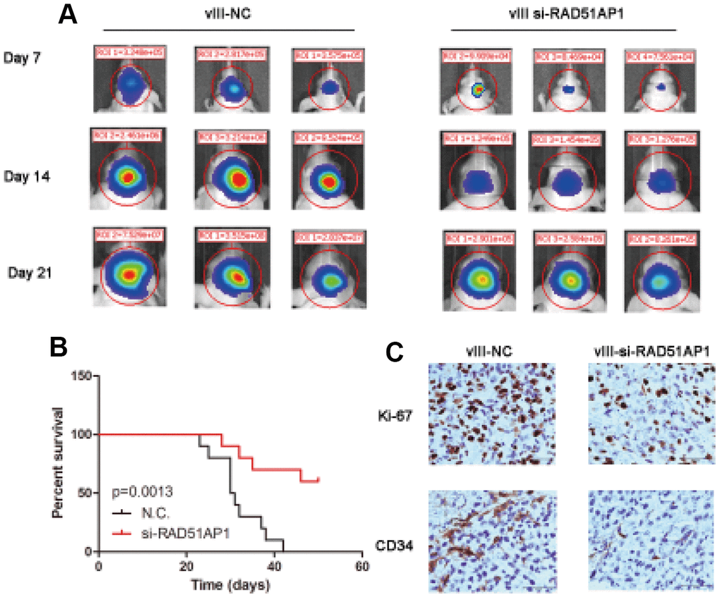 To investigate the role of RAD51AP1, we constructed intracranial mouse models using U87MG-EGFRvIII cells transfected with a negative control (N.C.) or si-RAD51AP1 lentivirus. In vivo imaging analysis at days 7, 14 and 21 revealed that knocking down RAD51AP1 significantly inhibited the tumor volume compared to that in the Lenti-N.C. group (Figure 7A). Low RAD51AP1 expression was strongly associated with longer survival times in mice (Figure 7B). Furthermore, immunohistochemistry (IHC) analysis indicated that the CD34 and Ki-67 expression levels were reduced in the RAD51AP1 knockdown group (Figure 7C).
