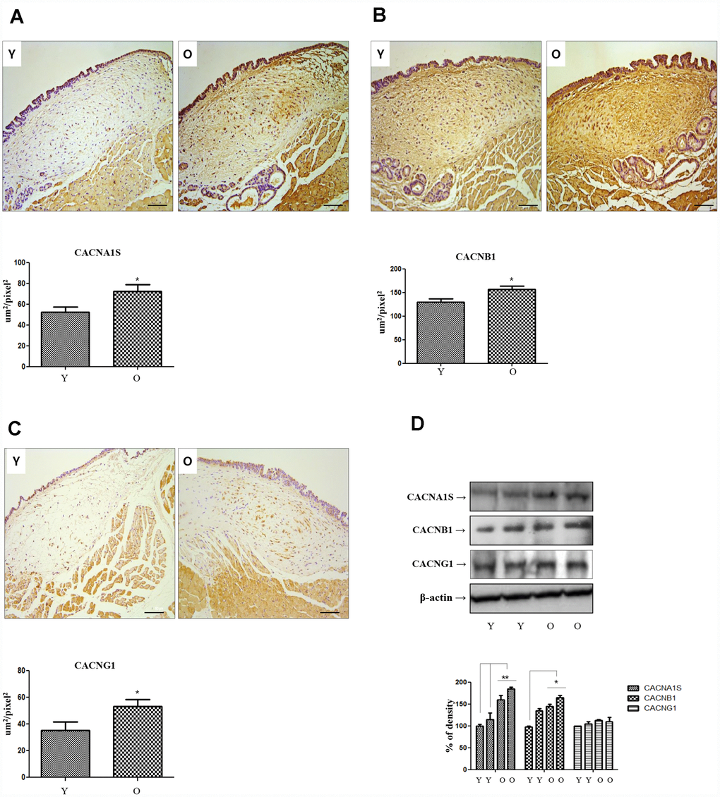 The results of NGS analysis showed that three of the 40 genes that were commonly increased in the lamina propria of the old rats compared to the young rats were calcium channel related genes. So, we selected 3 calcium channel related genes: voltage-gated calcium channels (VGCC) subunit alpha1 S (CACNA1S). VGCC auxiliary subunit beta 1 (CACNB1), and VGCC auxiliary subunit gamma 1(CACNG1). Immunohistochemical staining was performed for CACNA1S, CACNB1 and CACNG1. The expression of all three genes (CACNA1S, CACNB1 and CACNG1) were significantly increased in lamina propria of old rats compared to young rats (Figure 1A–1C). Western blotting was performed on three calcium channel related genes in the primary-culture rat vocal fold fibroblasts of young and aging rats, only CACNA1S was increased compared to young rats (Figure 1D).