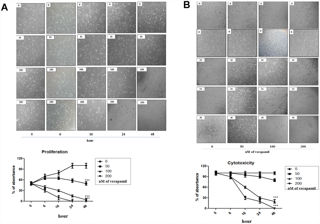 The effect of verapamil, one of the most commonly used VGCC blockers in clinical practice, on the proliferation and viability in hVFFs was investigated. MTT assay results showed that verapamil treatment reduced the proliferation and viability of hVFFs cells dose- and time-dependent manner (Figure 3A and 3B). As the concentration of verapamil increased, the proliferation and viability of hVFFs decreased. Also, the proliferation and viability of hVFFs decreased with increasing treatment time of verapamil.