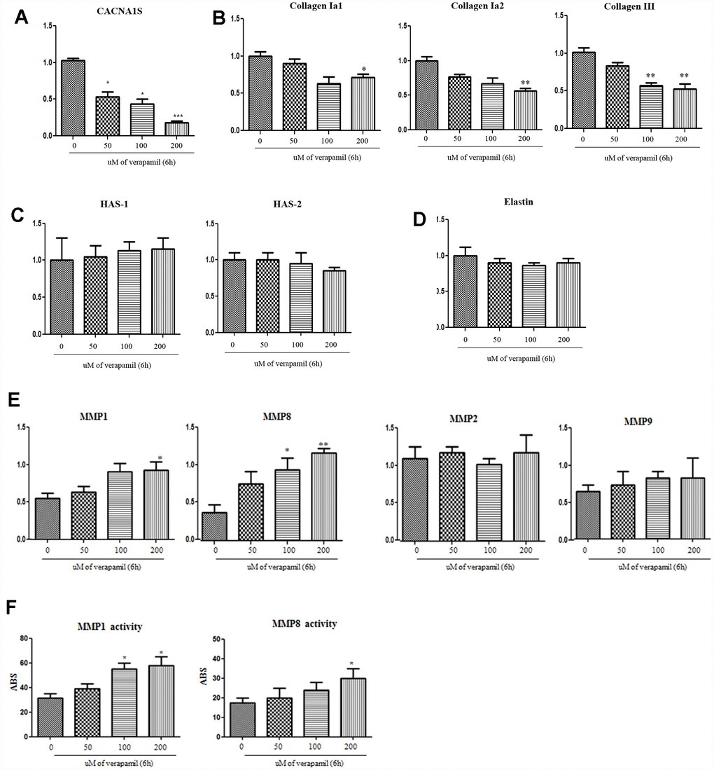 When the verapamil was treated with hVFFs for 6 hours, the expression of CACNA1S decreased in qPCR and Western blot (Figure 5A). Also, the synthesis of collagen I and III in hVFFs decreased according to the concentration of verapamil (Figure 5B). However, there was no effect on the synthesis of hyaluronic acid or elastin (Figure 5C and 5D). MMP-1 and -8, which are associated with the degradation of collagen, increased the expression and activity as the concentration increased (Figure 5E and 5F). However, there was no change in the expression of MMP-2 and -9 (Figure 5E).