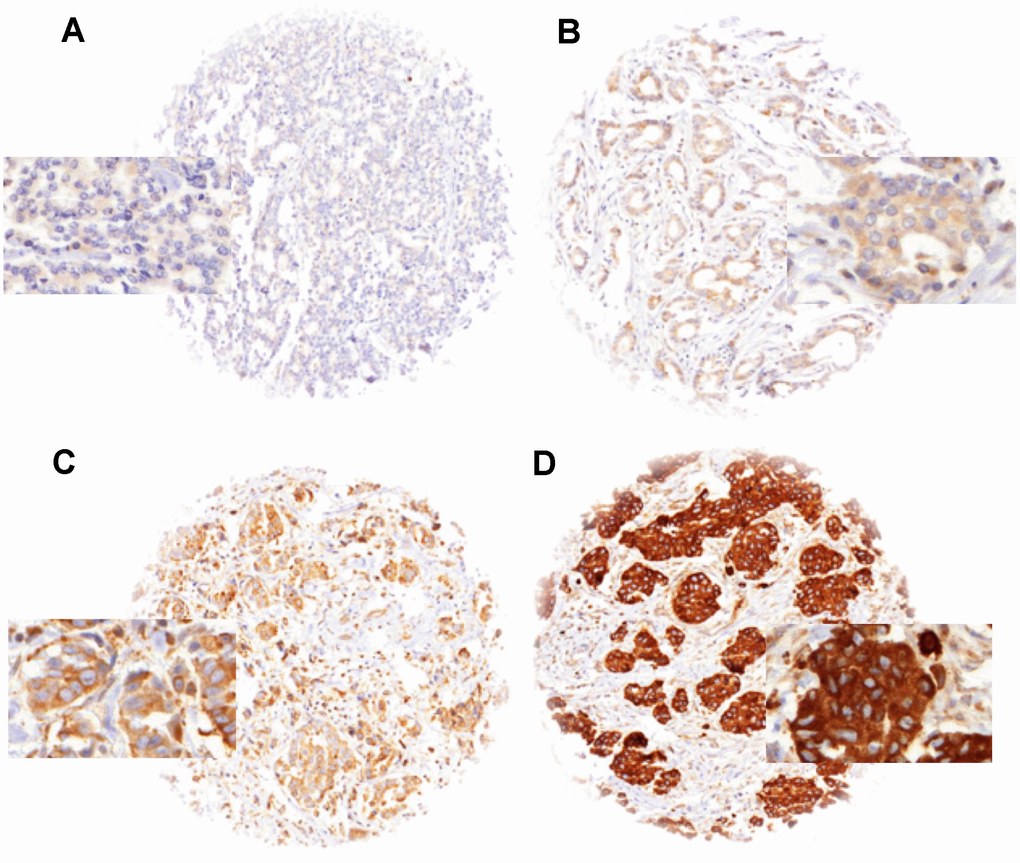 Freshly cut TMA sections were immunostained in a single experiment. Slides were deparaffinized and exposed to heat-induced antigen retrieval (5 min, 121°C in Tris-EDTA-citrate buffer at pH 7.8). Primary antibody specific for LPCAT1 (rabbit, Protein Tech; at 1/1350 dilution was applied at 37°C for 60 minutes. Bound antibody was then visualized using the EnVision Kit (Dako, Glostrup, Denmark) according to the manufacturer´s directions. LPCAT1 staining was found on the membrane and in the cytoplasm of positive cells. Evaluation of the immunohistochemical staining was performed as previously described [35]. In brief, tumors with complete absence of staining were scored as “negative”. Cancers with a staining intensity of 1+ in up to 70 %, or 2+ in ≤ 30 % of the tumor cells were scored as “weak”. A “moderate” score was given to cancers with a staining intensity of 1+ > 70 %, 2+ in up to 70 %, or 3+ in ≤30 % of tumor cells. The score was considered “strong” if staining intensity was 2+ in >70 % of tumor cells or 3+ in > 30 % of tumor cells.