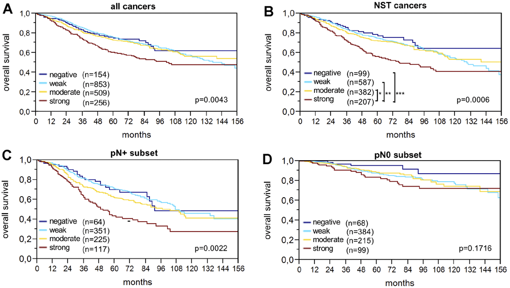 Raw survival data were available for 1,774 cancers with interpretable IHC results. Strong LPCAT1 expression was closely associated with shortened overall survival (p=0.0043; Figure 2A). The association between strong LPCAT1 expression and poor prognosis was even more pronounced in the subgroup of NST cancers (p=0.0006; Figure 2B) and in the nodal positive subset (p=0.0022; Figure 2C) but was not seen in nodal negative cancers (p=0.1716; Figure 2D). Multivariate analysis for NST cancers including pT stage, nodal status, BRE grade and hormone receptors did not identify LPCAT1 expression as an independent prognosticator of survival (Table 4).