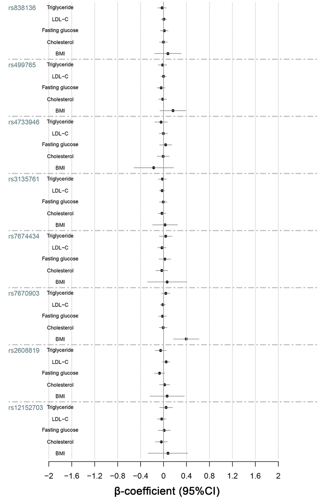 | BMI | KLB | rs7670903 | A | 0.40 | 3.49 | <0.001 | |||||||||||||||||||||||||||||||||||||||||||||||||||||||||||||||||||||||||||||||||||||||||||||