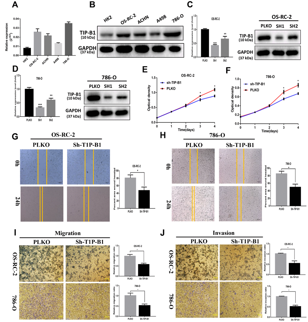 In order to investigate the function of TIP-B1 in KIRC cells, we firstly detected TIP-B1 expression in human immortalized proximal tubule epithelial cell line HK-2 and KIRC cell lines 786-O, ACHN, OS-RC-2 and A498. The expression of TIP-B1 was significantly increased in KIRC cell lines when compared with immortalized adult human kidney cell HK2 both in RNA level (Figure 3A) and protein level (Figure 3B). Then we knocked down TIP-B1 by shRNA (sh-TIP-B1) in OS-RC-2 (Figure 3C) and 786-O (Figure 3D) cells which have a higher endogenous TIP-B1 expression, and chose the higher efficiency shRNA1 for further investigation. Functionally, cells with sh-TIP-B1 exhibited significantly decreased proliferation potential both in OS-RC-2 (Figure 3E) and 786-O (Figure 3F) compared with controls according to CCK-8 assay. Besides, cells with sh-TIP-B1 performed less migratory capability in OS-RC-2 (Figure 3G) and 786-O (Figure 3H) cells using wound-healing assay. Similarly, using the transwell migration and matrigel-coated invasion assay, we found that knocking down TIP-B1 in OS-RC-2 and 786-O cells decreased cell migration (Figure 3I) and invasion (Figure 3J) abilities compared to the vector control (pLKO) group.