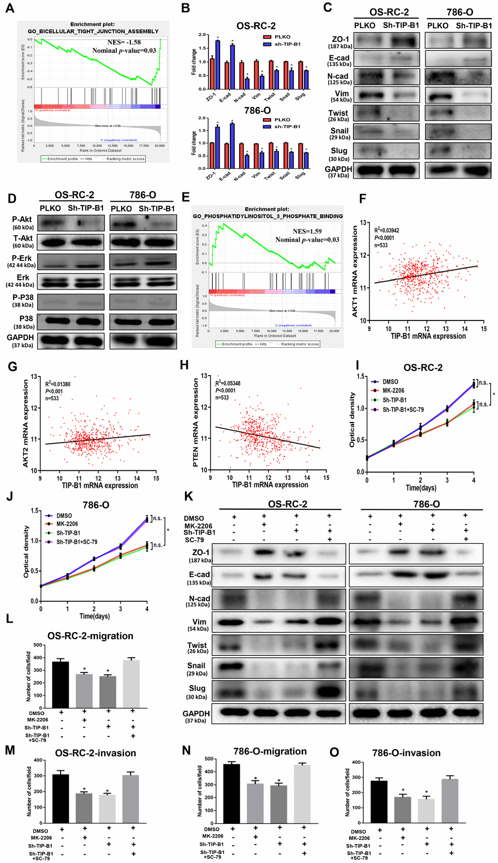 To elucidate the signal pathway that TIP-B1 plays role in, we detected AKT, p38(MAPK) and ERK, which were thought to be associated with KIRC deterioration and metastasis [14–16], and confirmed the phosphorylation of AKT molecules was clearly inactivated in both OS-RC-2 and 786-O sh-TIP-B1 cell lines, but ERK and p38 exhibited no changes (Figure 5D). Besides, the GSEA indicated phosphatidylinositol 3 phosphate binding genes enriched in TIP-B1 high group (Figure 5E), and TCGA correlation analysis also showed that TIP-B1 expression was positively correlated with AKT1 (Figure 5F), AKT2 (Figure 5G), and negatively with PTEN (Figure 5H), further demonstrating that TIP-B1 played a key role in the AKT pathway. In order to examine the effects of TIP-B1 on KIRC cell activities through AKT pathway, we treated KIRC cell with MK-2206 (a highly selective inhibitor of pan-AKT) or SC-79 (AKT phosphorylation activator) and divided cells into four groups (DMSO, MK-2206, sh-TIP-B1, sh-TIP-B1+SC-79). The CCK-8 assay showed both AKT inhibition and TIP-B1 knockdown could hindered KIRC cells proliferation, whereas AKT activation could attenuate the inhibitory effects of TIP-B1 knockdown on OS-RC-2 (Figure 5I) and 786-O (Figure 5J) cells. Besides, the increase of epithelial gene ZO-1, E-cadherin, and the decrease of mesenchymal gene N-cadherin, vimentin, twist, snail and slug caused by TIP-B1 knockdown could be rescued by AKT activation through WB assays in KIRC cells (Figure 5K). The rescue experiments of transwell assay also confirmed AKT inhibition could suppressed KIRC cells migration and invasion capacities, whereas AKT activation could release the inhibitory effects of TIP-B1 knockdown on KIRC cells (Figure 5L–5O, Supplementary Figure 8).
