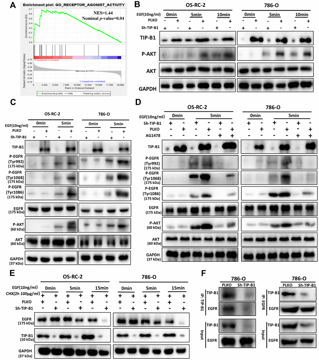 To investigate how TIP-B1 induces AKT signaling, we used GSEA analysis and found GO_RECEPTOR_ AGONIST_ACTIVITY was significantly enriched in TIP-B1 high group (Figure 6A), which means TIP-B1 interacts with some receptors to effect a change in the activity of those receptors. Previous studies have confirmed that activation of AKT signaling pathway is primarily through the interaction of receptor tyrosine kinases (RTKs) with their specific ligands, such as EGFR, which play important role in urological related tumors [17, 18]. So we tested whether TIP-B1 affected AKT signaling by interacting with EGFR. Interesting, knockdown TIP-B1 significantly inhibited AKT activation triggered by EGF stimulation compared to the control group (Figure 6B). More importantly, the phosphorylation levels of the three residues in EGFR (Tyr992, Tyr1068 and Tyr1086) were significantly reduced after downregulation of TIP-B1 (Figure 6C). Moreover, under the stimulation of EGFR-specific tyrosine kinase inhibitor (AG1478), the inhibitory effect of knockdown TIP-B1 on EGFR and AKT phosphorylation was furtherly enhanced, demonstrating that TIP-B1 might play a key role in EGFR mediated activation of AKT (Figure 6D).