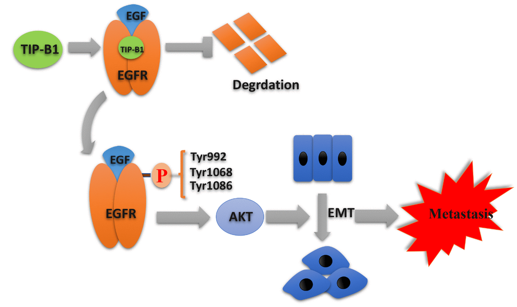 Together, these results strongly suggested TIP-B1 might promote KIRC cells progression and metastasis by binding EGFR and suppressing EGFR degradation, then promoting EGF-induced AKT signaling.