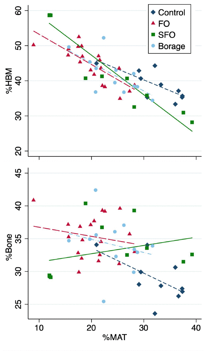 Overall MAT volume (including all groups) showed a strong negative association with HBM (r=-0.836, p<0.001), with the strongest association observed within SFO group (r=-0.949; p<0.001), followed by FO (r=-0.782; p<0.001), control (r=-0.758; p=0.011) and borage oil (r=-0.678; p=0.015) cohorts (Figure 1). There was an overall negative association between MAT and bone volume (r=-0.344, p=0.013), with associations being stronger in the control group (r=-0.586, p=0.075). None of the groups receiving fatty acid supplements showed significant associations between bone and MAT volumes (r=-0.225 to 0.332; p=0.337 to 0.482 for FO, SFO and borage oil groups respectively; Figure 1).