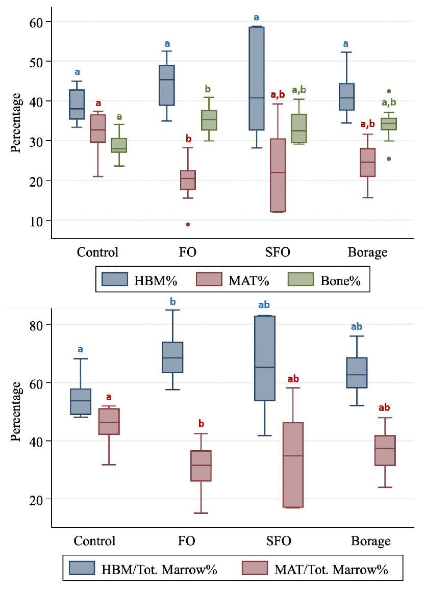 Furthermore, Omega 6 fatty acids may stimulate the uptake and depot of extracellular fats within cells [27], and ω3 fatty acids may potentially be able to compete them and slow down adipogenesis and associated lipotoxicity and inflammaging in the marrow milieu. In agreement with this hypothesis, feeding mice with a FO-rich diet can decrease PPAR-γ gene expression [10] in favour of osteoblastogenic and against adipogenic commitment of stem cells. Additionally, FO has been shown to reduce MAT volume [28] and promote hematopoiesis in the bone marrow [29]. However, to our knowledge the positive effects of FO on the prevention of MAT expansion and its protective effects on both bone and HBM - which is of high pathophysiological importance for both age-related bone loss and anemia - have not been reported before.