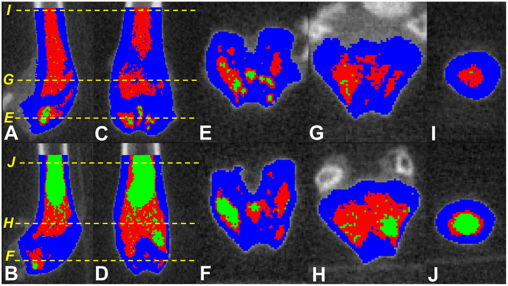 μCT images were saved in DICOM format. All CT slices within the region of interest were analysed by a single blinded observer using Slice-O-Matic® (Tomovision, Montreal, Canada), previously validated for the measurement of various tissue volumes in different species [1, 41–43]. CT Hounsfield values for bone, MAT and HBM tissues were calculated. We used protocols previously validated in animals to quantify yellow/red marrow and bone using a single energy CT (MicroCT) and image analysis using Slice-O-Matic software [43]. Previous publications on the tissue thresholds were consulted, and final threshold ranges used for quantification of these parameters were further refined visually, using an image histogram [43–47]. Thus, the following resultant CT number thresholds were applied: MAT ≤450; HBM 451-1900; and bone ≥1901 Hounsfield units (Figure 3).